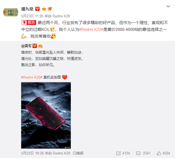 潘九堂评论红米K20 此前,小米产业部合伙人潘九堂表示,红米K20是2000-4000档价位的最佳选择之一。这似乎暗示了红米K20起售价将超过2000元。 今日上午10:00,小米商城红米K20开启预售,只需100元定金预定,5月28日支付尾款。