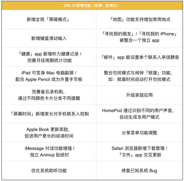 | 虽然苹果将 WWDC 2019 的开幕日期定在美国西岸时间 6 月 3 日,但关于将在 WWDC 登场的新品消息却提前了一个月到来。 作为苹果一年一度的开发者大会,今年 WWDC 将继续以软件系统为核心,iOS 13、macOS 10.15、watchOS 6 三款新系统、数项新功能将同时与我们见面。 除此以外,传闻已久的模块化 Mac Pro、6K 分辨率的 Micro LED 显示器产品也可能会在活动上相继登场。 黑暗模式对 iOS 设备意义重大 今年苹果不会在 iOS 13 的设计上做太大变动,UI 大体还是我们现在熟悉的样子,只是界面细节有一点小改变,重要的是新功能和系统交互优化。 ▲ iOS 13 概念图。图片来自:GearOpen 彭博社从知情人士处获悉,代号为 Yukon(加拿大育空地区,为北美洲水系发源地之一)的 iOS 13 将加入包括黑暗模式、iPad 分屏互动、手势键盘、新备忘提醒机制等数项新功能。 随着 iPhone 8 / X 全面升级到 iPhone XS / XR,苹果也逐渐将 iOS 的设计针对硬件特性优化,最明显的一点是 iOS 13 新加入的「黑暗模式」。相比于我们目前在用的灰白色页面,黑暗模式将会把系统页面全局暗色调处理,从而降低 iPhone XS 和 XS Max 的 OLED 屏幕功耗。 自去年的全面屏热潮开始,更易于切割加工的 OLED 屏幕便成为了手机厂商的新宠儿。这种具备像素自发光的屏幕不但能提升厂商一直追求的「屏占比」,而且还能在部分场景下节省屏幕功耗。而随着 OLED 成为当下主流,针对其特性的技术(屏下传感器)和功能也应运而生。 ▲iOS 13 概念图。图片来自:YouTube 黑暗模式(Dark Mode)并非 iOS 首发,因为早在去年三星公布的 One UI 我们就已经对这个功能有所耳闻,再到 Google 即将发布的 Android Q,我们也能看到全局暗色系风格的黑暗模式。而能让厂商热衷于推行黑暗模式的原因,其实主要是因为要延长 OLED 的寿命和迎合用户的使用习惯: 用户在暗光环境下看手机的时间越来越长通过黑色像素来曲线延长 OLED 的使用寿命和电池续航 去年苹果在 macOS Mojave 加入黑暗模式后大受欢迎,尽管该功能的出发点是让用户在使用 Mac 时更专注,但仍然有许多用户希望将 macOS 的这个暗色系主题「移植」到使用频率更高的 iOS 设备上。 比如同样运行 iOS 的 iPad,相信大部分人都不愿意在关了灯的房间里拿着一块 12.9 英寸、600 尼特的「发光板」当台灯。 既是平板也是手写板的 iPad 在加入 Apple Pencil 和 Smart Keyboard 后,iPad 的生产力得到大幅提升,然而与手机同样的 iOS 系统却让 iPad 更像是放大版的 iPod Touch,而不是一台真正意义上的平板电脑。 因此,在这次 iOS 13 的更新中,苹果针对 iPad 的特性进行了功能调整。根据 9to5Mac 的消息,苹果将会在这次更新中为 iPad 加入与 Magic Mouse 的配对连接功能,用户可在 iPad 和鼠标连接后,使用 Magic Mouse 鼠标控制光标或进行手势操作,提升设备的交互效率。 ▲ iPad Pro 适配鼠标概念图 此外,本次更新还将增加 iPad 和 macOS 的多屏联动。消息透露,新系统能让 iPad 与 macOS 实现分屏连接,在日常使用下,iPad 可充当 Mac 的另一块显示屏;在需要使用画板、手写板功能时,用户也可以用 Apple Pencil 在 iPad 上作画,继而补充 iMac 或其他 Mac 设备屏幕不可触控的功能缺陷。 健康仍是苹果想要你关注的地方 去年苹果在 iOS 12 中加入了 「屏幕使用时间」来防止用户长时间沉迷手机,并提供家长控制功能让家长控制孩子的手机使用时长。现如今,有消息指出苹果将在 iOS 13 中加入声音「听力健康」监测和联系人控制策略。 相比于用开屏时间来统计使用时长,听力健康监测是根据手机声音播放大小、时长来得出用户的听力健康情况。根据美国疾病卫生组织统计,在 20~69 岁年龄段的人群中,有 15% 因噪音造成听力损失,而且,长期佩戴耳机也会对用户造成头痛、耳鸣等症状。 家长控制功能将继续深化到联系人列表中,目前在 iOS 12 系统中,用户可通过「家庭共享」控制孩子用手机的时长,而在新版系统中,用户甚至还能对联系人列表进行控制,比如在 23 点后,孩子只能用 iPhone 打电话给父母。此外,苹果还将在新系统内对「健康」功能继续完善,比如在记录用户日常活动后,能提供监测项目更详尽的报表。 根据彭博社公布的预测报告,iOS 13 的新增功能(包含已有和计划)整理如下: 值得一提的是,彭博社在预测报告中还预告了苹果正在开发代号为 Azul 的 iOS 14 系统,该版系统将支持苹果全新的 AR 功能和 5G 网络,至于公布时间和 iOS 的更新节奏一样,它将会在 2020 年和我们见面。 也就是说,今年的新 iPhone 可能仍然仅支持 4G 网络,对 5G 的适配最快也得等到 2020 年了。 独立 app 的 Apple Watch,真正的可穿戴设备 Apple Watch 从初代登场到今天已有数个年头了,在过去几年的升级中,Apple Watch 已经从单一的腕上记录装置发展成为可独立使用的智能穿戴设备。 而在这次 watchOS 的更新中,苹果将对其加入 App Store 商店,并内置多个预装 app,从而使设备更加独立。 根据目前已知的网络消息,新 watchOS 将带来 7 项变化: 增加 App Store,并提供设备独立应用增加语音备忘录功能增加 iPhone 的 Animoji / Memoji 贴纸同步增加 Apple Book 程序,可使用手表听书增加健康类 app,一款用于服药提醒;一款用于经期追踪增加表盘功能显示项,包括音频读物进度条、耳机剩余电量等增加数款新表盘,包括:渐变色表盘、大字体表盘两大类不难看出,相比于过去「增强与 iPhone 连接性」的常规更新,本次 watchOS 的更新方向已经