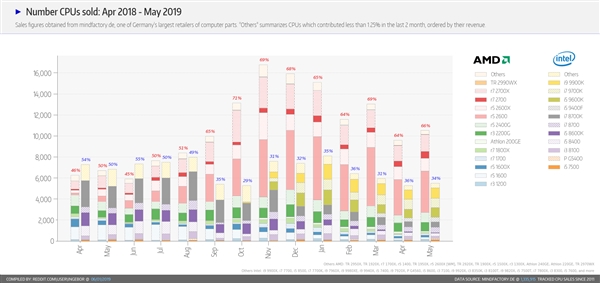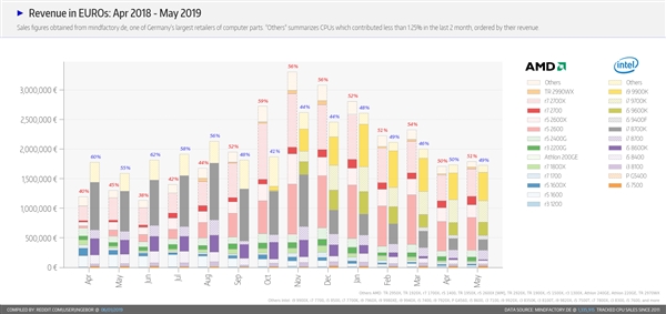 销量柱状图 从历史列表来看,AMD已经连续 10 个月在处理器销量方面明显压制Intel。在售产品中,AMD卖得最好的型号是锐龙5 2600,Intel这边则是i9-9900K。