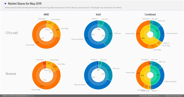 AMD在刚结束的台北电脑展上推出了第三代锐龙处理器,基于7nm Zen2 架构,首批 5 款产品将于 7 月 7 日上市,国行 1599 元起(锐龙5 3600)。 就目前的市场态势来看,三代锐龙可以说是AMD的乘胜追击之举,来自德国大型硬件销售商MINDFACTORY的最新统计显示,刚过去的 5 月份,锐龙CPU/APU的销量占比为66%,Intel酷睿则只有34%。
