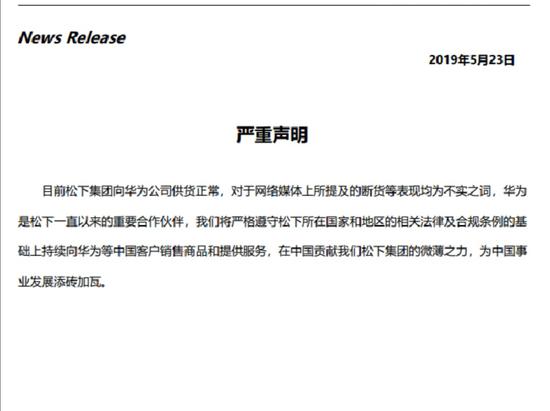 松下在声明中称,目前松下集团向华为公司供货正常,媒体报道不实。华为是松下一直以来的重要合作伙伴,松下将严格遵守所在国家和地区的相关法律及合规条例的基础上持续向华为等中国客户销售商品和提供服务。