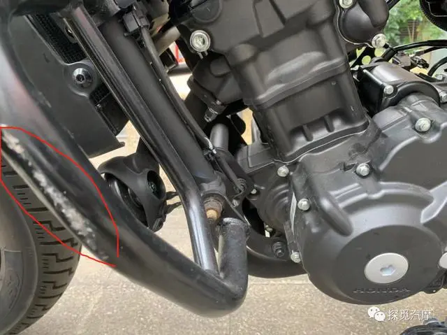 这里必须要指出,这台车脚踏的探针是出奇的短,几乎跟脚踏前沿位置持平了。这一点我个人可以理解,因为这台车真的是没有一丝的空间再用来降了,探针那一点点的长度都不行了。 所以说CM300的磨脚踏,还真是磨脚踏了。各位一定要注意骑行姿势,切勿外八字。 排气管 排气管质感说实话我觉得比如豪爵、高金等国内一线做工来说一定是不算好的。