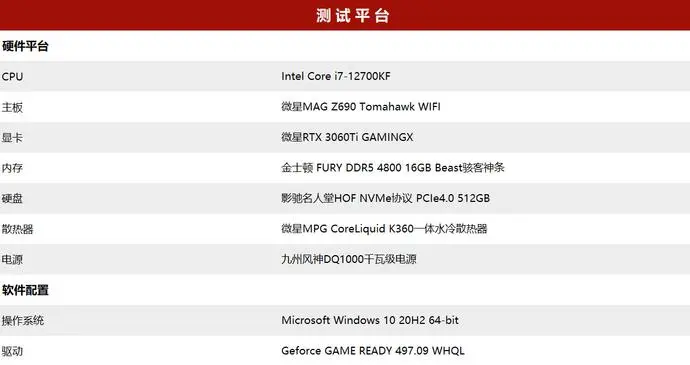 这次测试搭配的CPU采用了最新的英特尔12代酷睿桌面处理器,型号为Intel Core i7-12700KF,非常契合RTX3060Ti用户的实际装机选择,主板选择的是微星MAG Z690 Tomahawk,内存为单条金士顿Beast DDR5-4800 16GB,电源是九州风神的1000W金牌全模组电源,其他配置如上