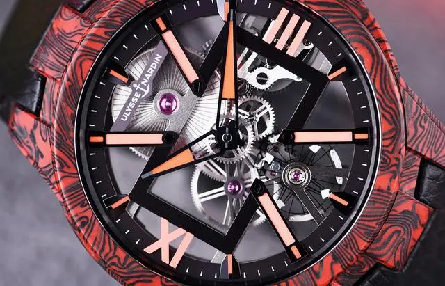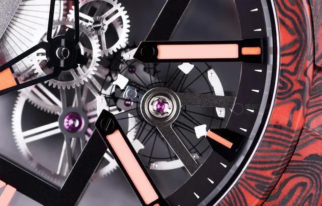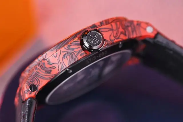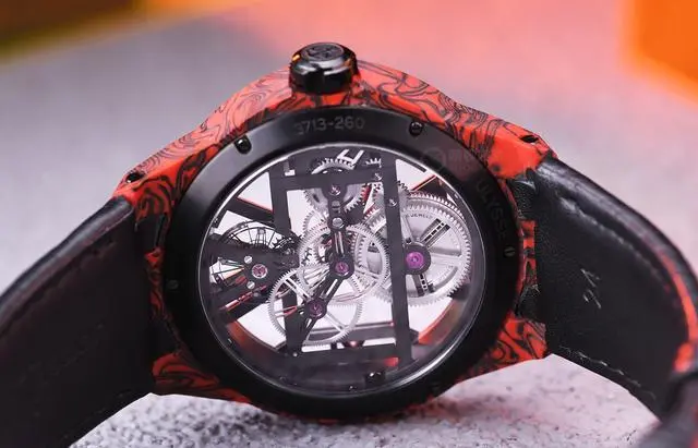 除了迷人的镂空设计之外,这款腕表还采用了超轻碳纤维与红色大理石纹环氧树脂来打造表壳,营造出如同火山岩浆般的视觉效果。表壳这一特殊材质可以在表面形成黑色的纹理,黑色和红色的色彩碰撞炸裂眼球,每一款腕表的纹理都不相同,每一款腕表都是独一无二的存在。因为材质优秀的特质,这款腕表非常轻盈,戴在手上不会对手腕有任何负担。