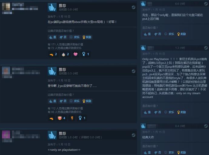 给予好评的玩家表示,在PC上玩PS游戏使用Xbox手柄,真是好耶。奎爷上PC后穿啥,可就由不得你了!也有玩家表示用电脑打战神,比主机更顺畅更高清。原价买就对了,不买对不起自己!还有许多人说这游戏经典,爽爆了!