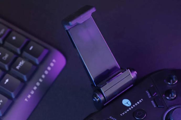 外观较为简洁,走实用路线 雷神战斧G50采用了较为简洁的设计风格,整个游戏手柄将黑色作为主色调,正上方印有雷神的Logo表明其“出身”,手柄正面的塑料外壳采用了类似喷砂工艺处理,手感较为细腻,握把则进行了激光雕刻,防滑效果不错。这款手柄上手时的持握感比较饱满,像我这样手比较小的玩家能够轻松驾驭它。如果不算手机支架,其重量仅200g出头,手感略显轻盈。我也试着装上一款重约190g的手机,可以明显感觉到手柄+手机的重量主要集中在双手的食指和中指上,这自然在我的意料之中,令我比较满意的是握把没有明显上翘的感觉,所以装上手机后,雷神战斧G50给我的手感还是比较舒适的。