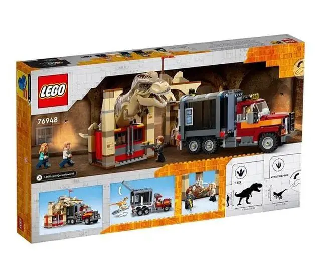 套装参数: 零件数: 306 人仔:3个 尺寸: 9cm高 x 22cm宽 x 30cm深 发售日期:2022年4月17日 海外售价: 79.99 AUD / 49.99 CAD / 49.99 EUR / 44.99 GBP / 39.99 USA 中国售价:499元 76948 World T. rex & Atrociraptor Dinosaur Breakout