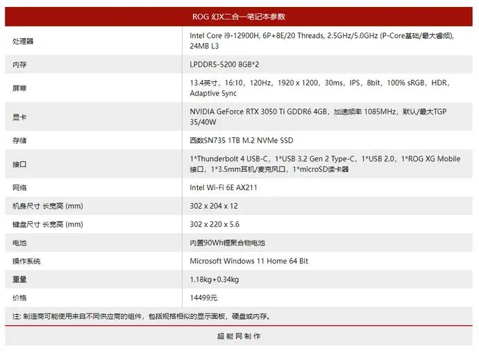 ROG幻X是少有的高性能二合一轻薄本,它配备一块16:10的13.4英寸FHD屏幕,120Hz高刷新率,最高可选配Core i9-12900H加GeForce RTX 3050 Ti独显,还有Core i7-12700H加GeForce RTX 3050独显和Core i5-12500H核显版本可选。 本次测试的ROG幻X二合一轻薄本详细规格如下: