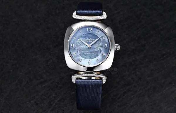 表盘来自格拉苏蒂原创位于德国普福尔茨海姆的表盘厂,经过了精心的处理,采用了冰河蓝色珍珠母贝表盘,中央装饰了玑镂花纹,3点、6点、9点和12点应用压嵌阿拉伯数字时标,其他则采用钻石镶嵌时标,搭配柔美的柳叶指针,传递出了女性的柔美姿态。