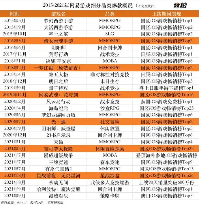 如上图所示,自2015年起,网易游戏先后推出《梦幻西游》手游、《大话西游》手游、《倩女幽魂》手游、《一梦江湖》等MMORPG产品。 一方面,公司在端游时期沉淀了大量这一品类游戏经验,具备一定研发优势;另一方面,这些手游产品基本上都衍生于公司已有知名端游IP,核心玩家很大一部分源自多年积累的粉丝群体。 需要提出的是,在这一阶段,国内手游市场还存在腾讯等同一梯队的竞争对手,以及试图借助手游时代机遇弯道赶上或超车新兴势力的挑战。 或正因如此,网易游戏选择手游化、创新研发两条腿走路的策略。在细分品类手游市场打下的江山,一定程度上也加固了网易游戏在行业中的地位。 例如2015年的《率土之滨》、2016年的《阴阳师》等,不仅位列国区iOS游戏畅销榜头部位置,更是在SLG、回合制卡牌手游领域成为标杆性产品。