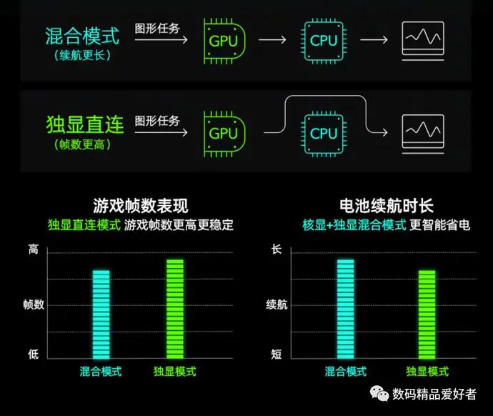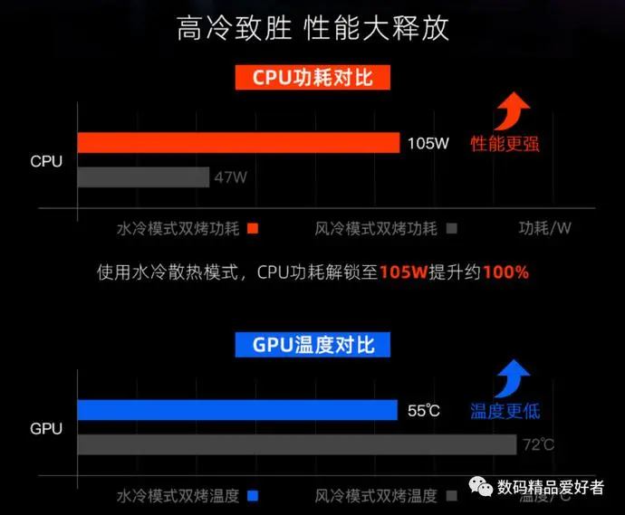 连接水冷后,双烤模式下CPU功耗能从47W解锁到105W,GPU保持150W功耗不变的同时,温度大幅下降,长时间游戏时帧率更稳。