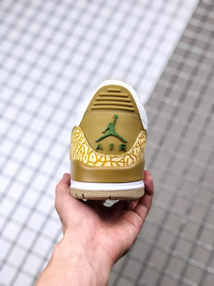 采用皮革、网眼布和翻毛皮材料制成。它采用白色底座和金色大象印花覆面,并配有橄榄绿鞋带和品牌。棕褐色橡胶外底顶部的白色中底完成了该设计。