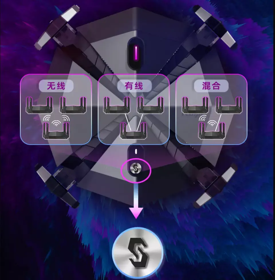 锐捷天蝎电竞路由器,支持一键Mesh组网,支持有线+无线的混合组网,支持锐捷同品牌跨型号混合组网。在相同品牌中,只需要两台锐捷路由器靠近,然后按锐捷路由器上的易联按键,等待几秒钟,就可以自动实现组网,组网之后,WIFI名称、WIFI密码保持一致,sid为同一个,用户在使用过程中,会自动动态的无感切换至信号最强的路由器,不需要再登录管理界面操作。