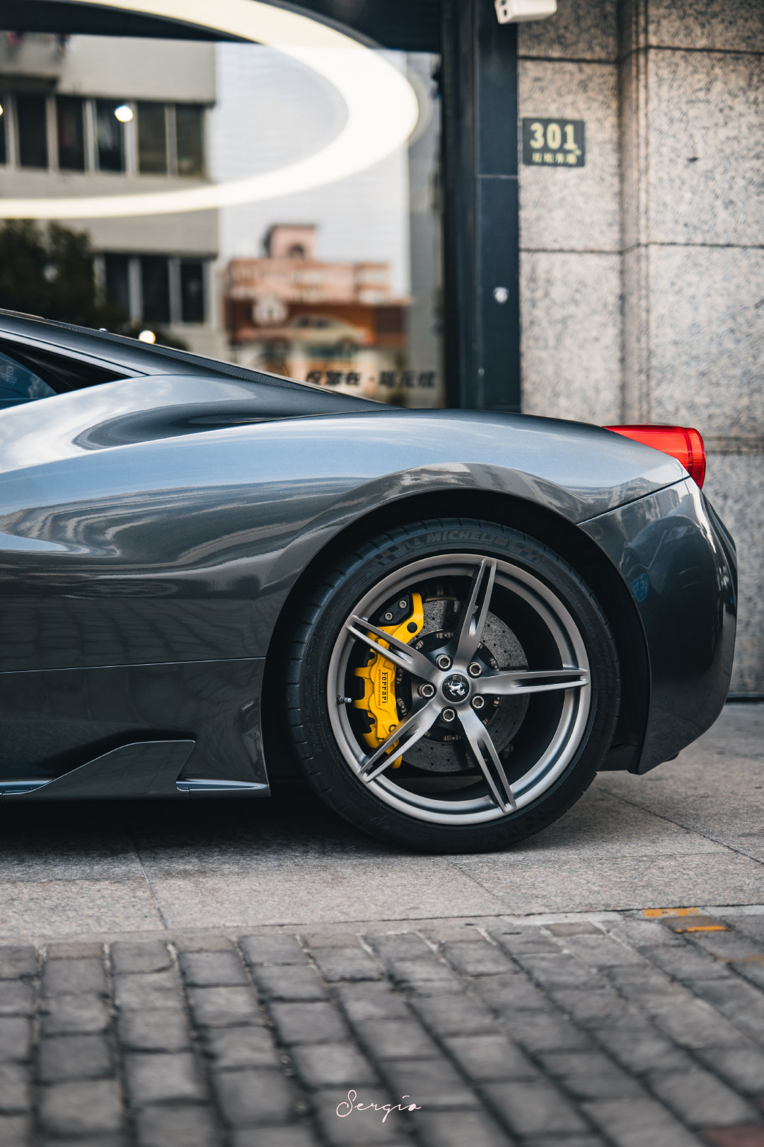 很惊喜能在上海遇见这台灰色的458 Speciale 灰外搭配黑条纹,黄色的卡钳以及黑黄的座椅,这样的搭配对于一台法拉利来说真是非常的特别,非常有质...