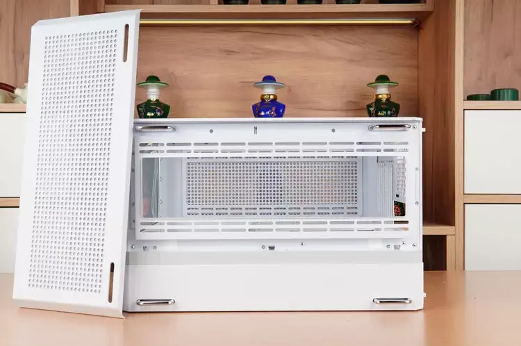 在拆卸下编织提手后也可以顺利打开机箱的顶部盖板了,这块盖板通过磁吸的方式固定,打开的时候也无需攻击拆卸。打开后即可看到顶部的风扇安装支架,此处最大可以支持360mm冷排的安装。
