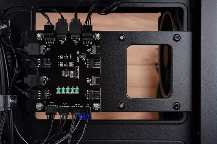 PURE BASE 500 FX的箱体背部预装了一块ARGB+PWM集线器,最大可以支持6组PWM风扇与6组ARGB灯光,机箱出厂预装的风扇占用了4组,剩余两组空位刚好对于机箱顶部的剩余的2个风扇位。这个支架还可以在右侧安装一个2.5寸的SSD硬盘。