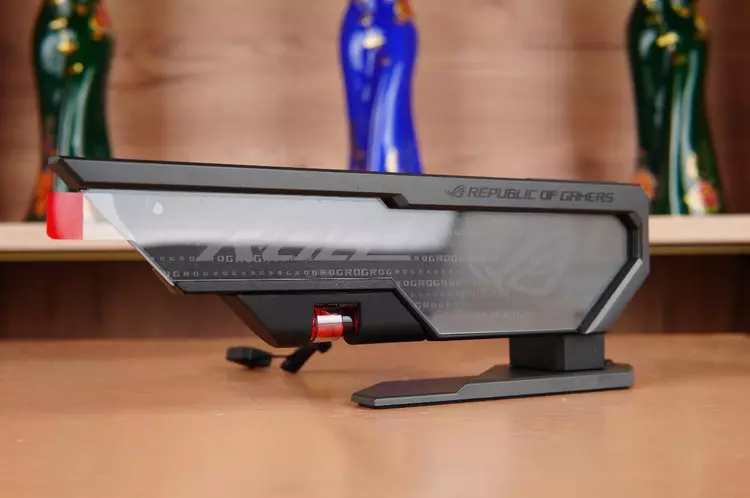 这款ROG大力神显卡支架整体的外观设计风格与ROG STRIX系列显卡非常的搭配,两者放一起绝对是最佳搭档。支架表面大面积的透明区域也就意味着绝对会有RGB灯效的存在。