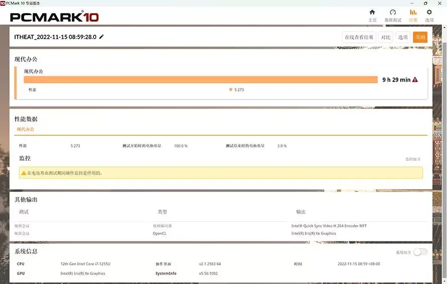 官方宣传这款笔记本的电池续航最长可达18小时,不过18小时肯定不是多数打工人日常使用的环境,相对来说PCMark 10的电池续航测试成绩更有参考意义,背光键盘的应用会对笔记本的续航成绩造成一定的影响,因此续航测试的环境我们将轻薄本的键盘背光功能关闭,屏幕亮度设定在70%,并且电脑关闭节电模式,在这个日常使用状态下,笔记本从满电到电量耗完历时9小时29分钟,一天高强度的办公应用是没有任何问题的。