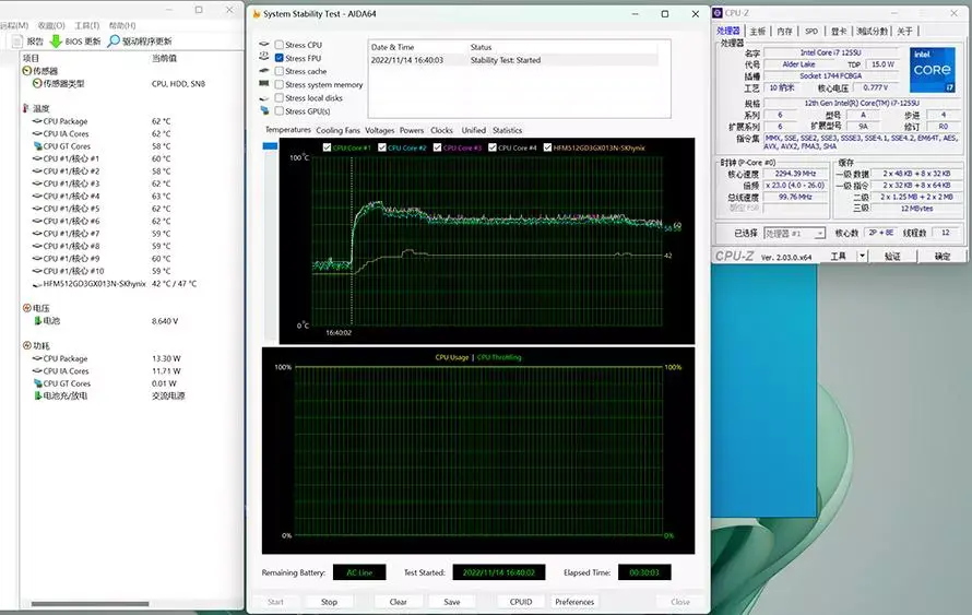 再来看一下单烤成绩,30分钟的单烤下,笔记本C面常用的WSAD按键区域温度为46.3℃,C面中间的区域也发热明显,CPU的温度控制在60℃上下,功耗基本维持在15W以内,调度策略上可以说是相当保守了,当然作为一款办公向的轻薄本,续航的权重要远高于性能,这也是可以理解的。