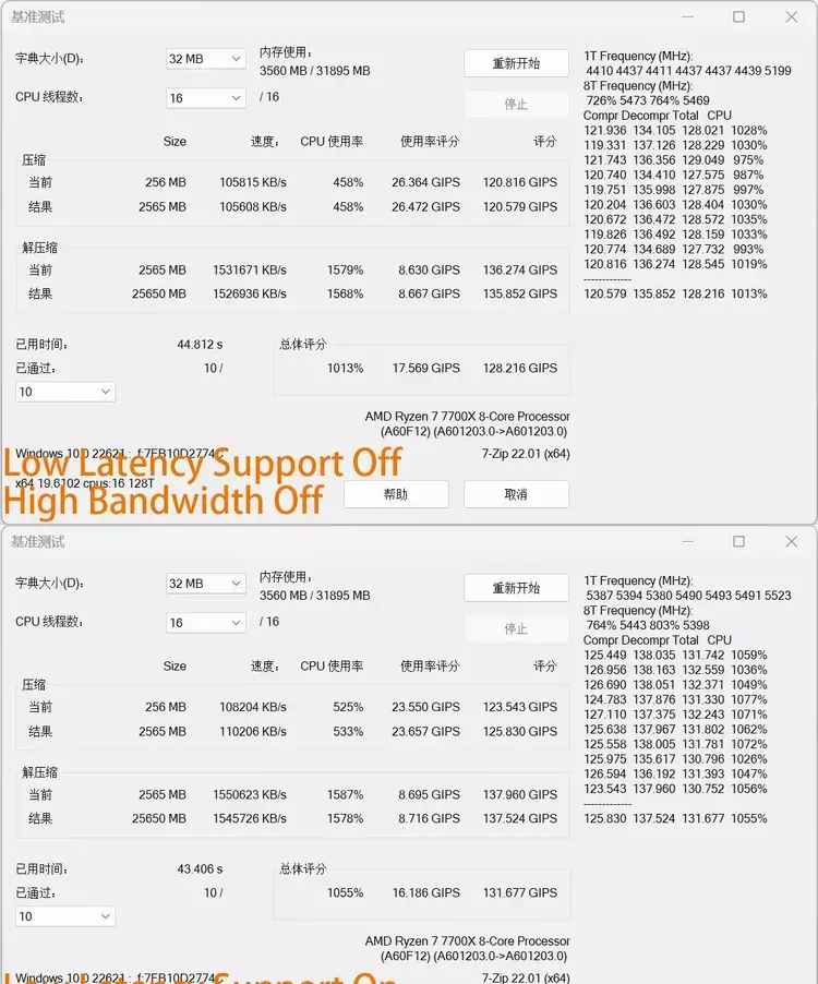 光理论看着当然不够,实践才是王道,先来跑跑7-ZIP基准测试,开启前压缩速度为105608 KB/s,解压缩速度为1526936 KB/s,开启后压缩速度为110206 KB/s,解压缩速度为1545726 KB/s,分别提升了4.3%和1.2%,对于日常用户的解、压缩文件任务会有一定的性能提升。
