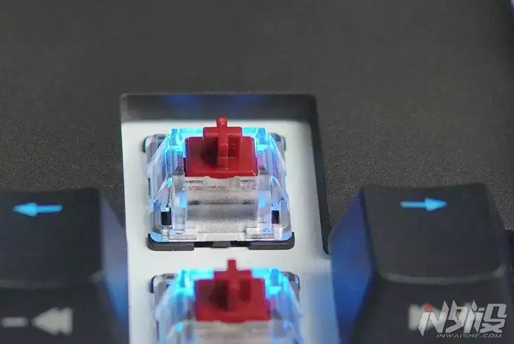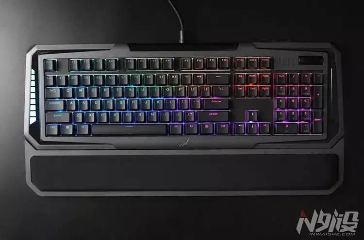 键盘左侧有一条灯带,开机常亮,并且能通过FN+End组合键独立调整灯效。右上角有4颗指示灯,多出来的一颗,乃是游戏玩家必须要的Win锁定。并且,键盘搭载了一颗音量旋钮。不过这颗旋钮在Windows环境下对音量大小的细分控制还不够精准,每个刻度会让音量进退4%。低音量下想要精调,还要到Windows环境下手动设置。