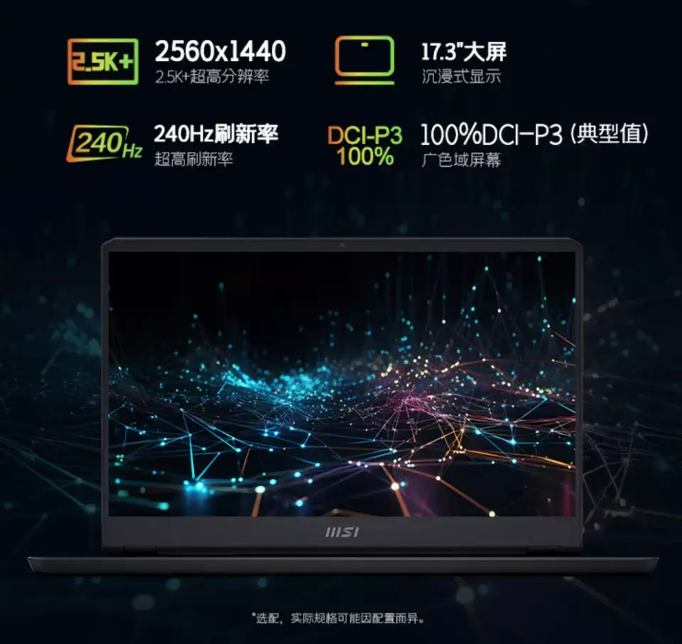 雷影17采用17.3英寸2.5K屏幕,拥有100% DCI-P3广色域和240Hz刷新率,可惜不是更潮流的16:10,下边框较宽,影响了屏占比参数和视觉上的沉浸感。