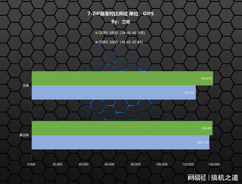 在该测试中,开启XMP相较默频,压缩性能和解压性能均有较为明显的提升,其中压缩性能更是有高达10.43%的提升幅度,高频内存对办公性能的加成由此可见一斑。