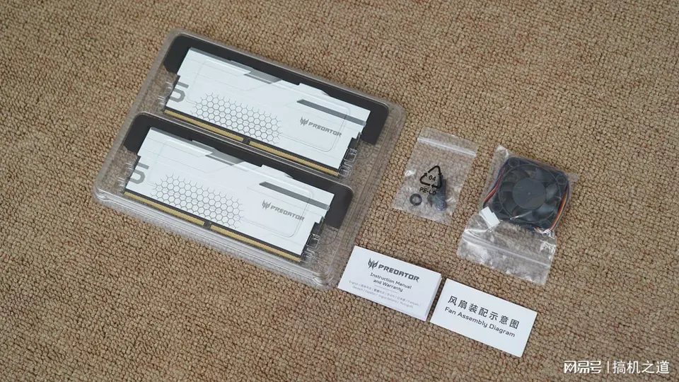 内存附件除了说明书、质保卡外,还附赠了一个4cm的小风扇,其实内存在正常XMP频率下是用不到的风扇的,不过超频时热量较大,安装风扇可大大提高稳定性,这一点还是非常贴心的。