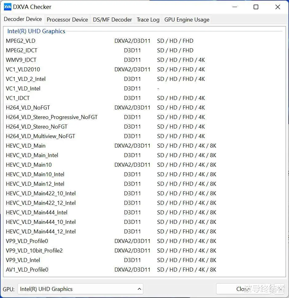 但说到生产力和影音娱乐用途,那就是INTEL核显的强项了。解码方面,H264,H265,AV1,VP9等格式都支持至少4K分辨率,H265(HEVC)甚至12bit,444采样空间规格的解码都支持。