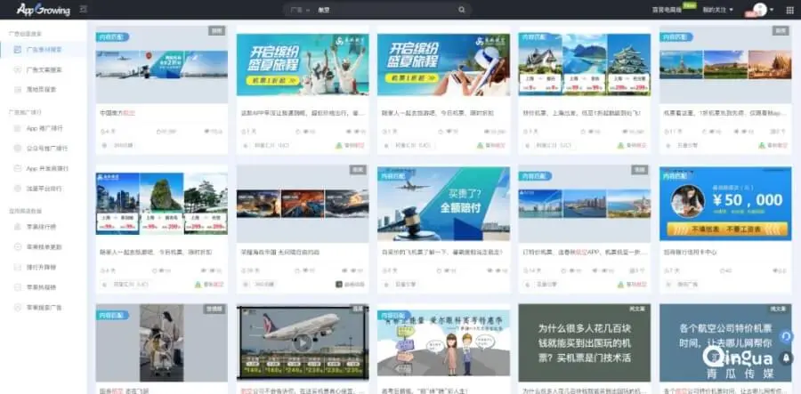 所以针对性灵感搜集可以用App Growing 里的创意搜索功能。App Growing中有大量相关的素材,具体的筛选维度可以根据实际情况自己设定和选择,如下图是某产品名称 在特定平台的搜索结果。 -根据需要做精准搜索- 搜集完灵感素材后,需要对素材进行分析和分类。结合广告主的目标,规避已经用过的创意和竞品的设计方案,设计符合广告主的目标的创意素材。 比如我们设计航空公司的活动,除了围绕活动本身主题。还可以从哪些地方展开呢?我们的目标是要让更多的用户知晓并参与我们的活动。那用户参与活动的目的是什么?用户购买机票的需求是从哪里出发的? 经过搜集分析后我们列出了三个方向: 1)突出机票促销,特价 2)突出优质服务(售前、售中、售后) 3)从机票需求角度出发,通过著名景点风景图结合节假日活动等 -我们筛选出来的参考方向- ◆ 设计中 通过前期搜索的灵感,开始设计,这里不具体展开广告创意设计过程。需要注意的是,根据实际情况设计相应的广告位创意素材尺寸。注意积累记录相关的位置的素材尺寸信息,对于效率提升有帮助。 ◆ 设计后 设计完广告素材后就可以进行投放了。投放工作通常由优化师安排,需要配合节点、人群定位等具体的运营情况进行,此处也不展开。投放出去后,考验设计师们的难题才真正的来了。 投放后大约2小时后大概就可以看到广告的投放效果。这个时候设计师可以到后台看看相关数据,或者与配合的优化师沟通拿到相关数据。通过数据效果来优化广告创意素材。 - 对于数据效果好的素材可以选择性的挑选类似的渠道或者不同的广告位进行更精准衍生设计,设计不同尺寸或者其他位置的广告给到优化师去投放验证广告创意的续航能力,验证不同渠道是否都好;