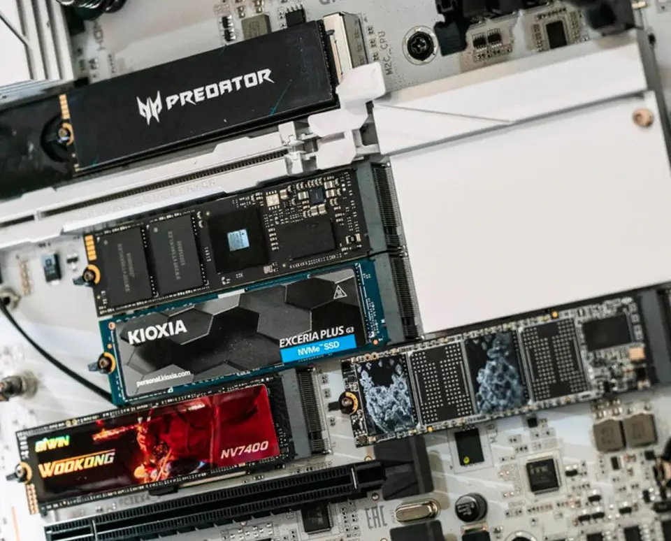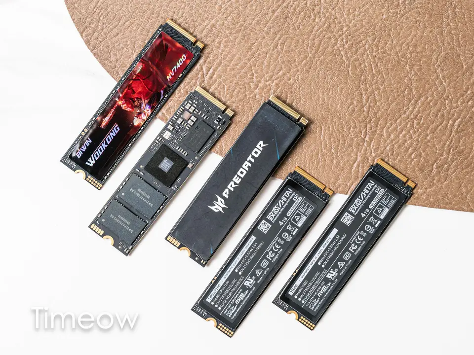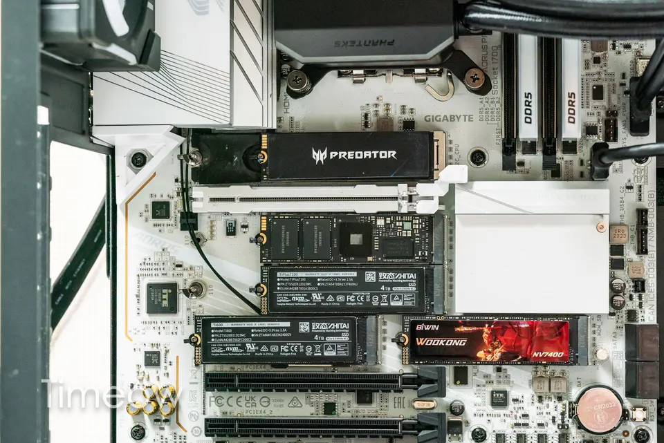 上面插了5根NVME SSD,大部分都是我在去年价格低谷期间购入的,分别是2根宏碁掠夺者GM7000 2T、铠侠EXCERIA PLUS G3 1T、佰维悟空NV7400 4T,以及一根从零刻迷你主机上拔下来的512G镁光颗粒/Maxio主SSD。