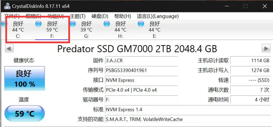 C盘和F盘分别是两块宏碁掠夺者GM7000 2T硬盘,C盘加了金属散热器、使用了自带石墨烯导热垫,F盘仅用了自带的石墨烯导热垫,在待机过程中,温度分别为44摄氏度和59摄氏度,温差15摄氏度。所以,用这款硬盘的同学,一定要做好额外的散热工作。
