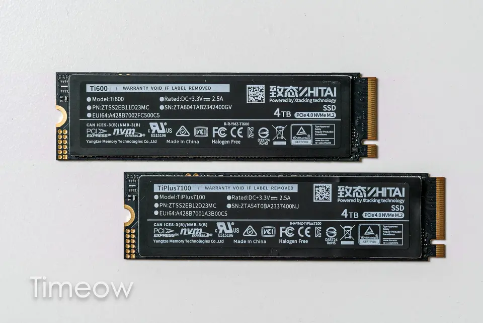 致态的TiPlus7100和Ti600,分别用了TLC和QLC颗粒,容量皆为4T。
