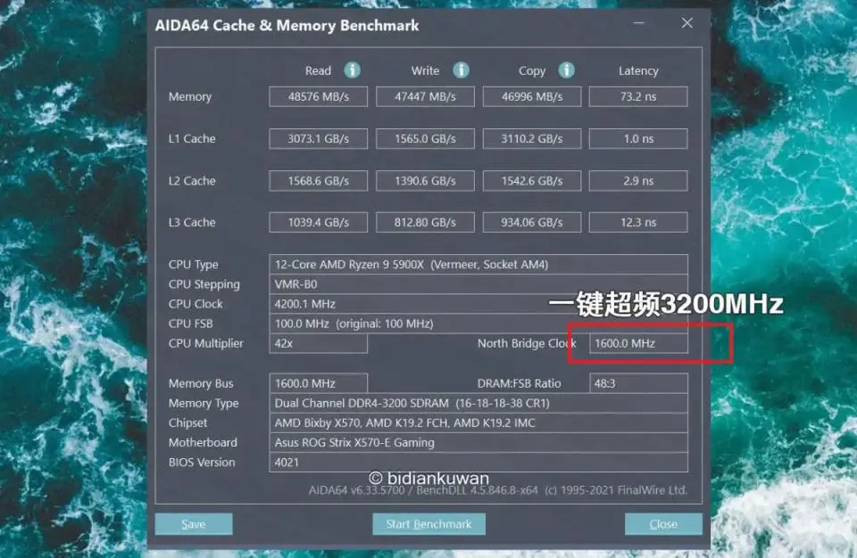 AIDA64内存测试同样可以对比出差距,读取48576MB/s,写入47477MB/s,复制46996MB/s,延时73.2ns。