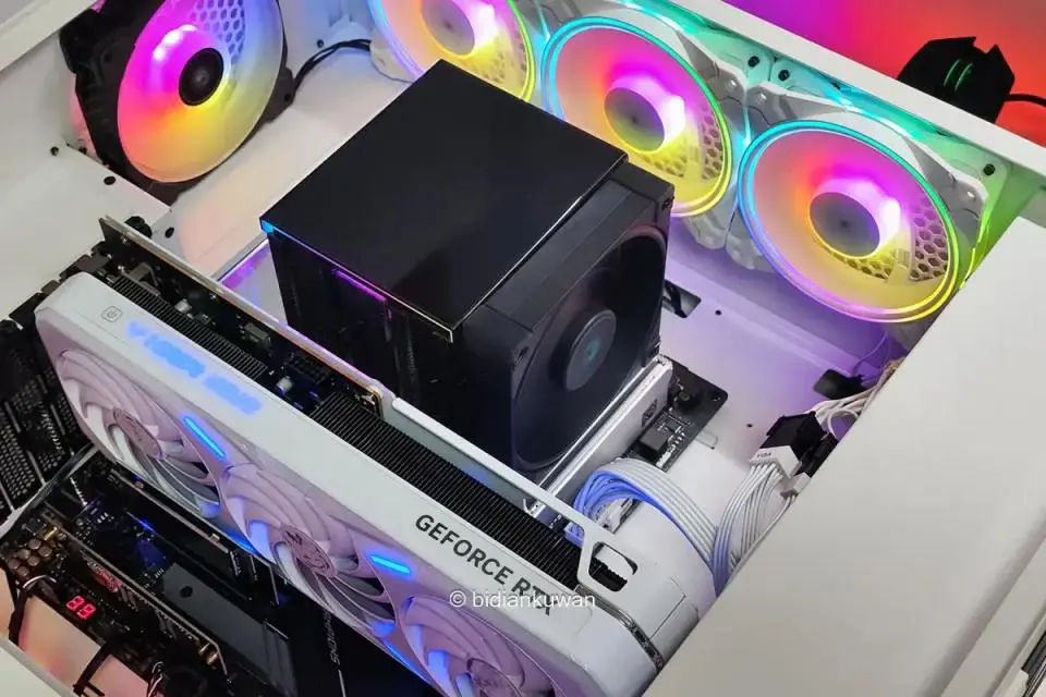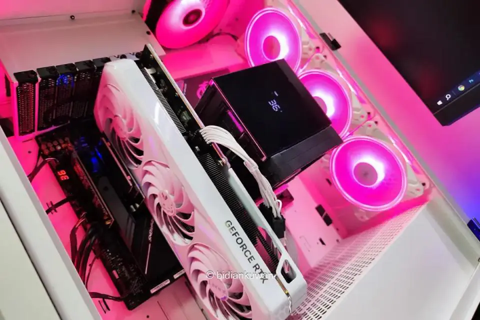 如下图装机环境所示:机箱鑫谷开元T1是市面上比较少见的全塔右侧透(到今年我已经换了常规海景房了),白色高塔机箱空间很大,显卡是白色的铭瑄RTX4070瑷珈限定版,虽然主板、CPU散热器是黑色的,但用这4根银白色马甲条装上去一点也不违和,甚至有点专属搭配的味道(白加黑熊猫配色)。