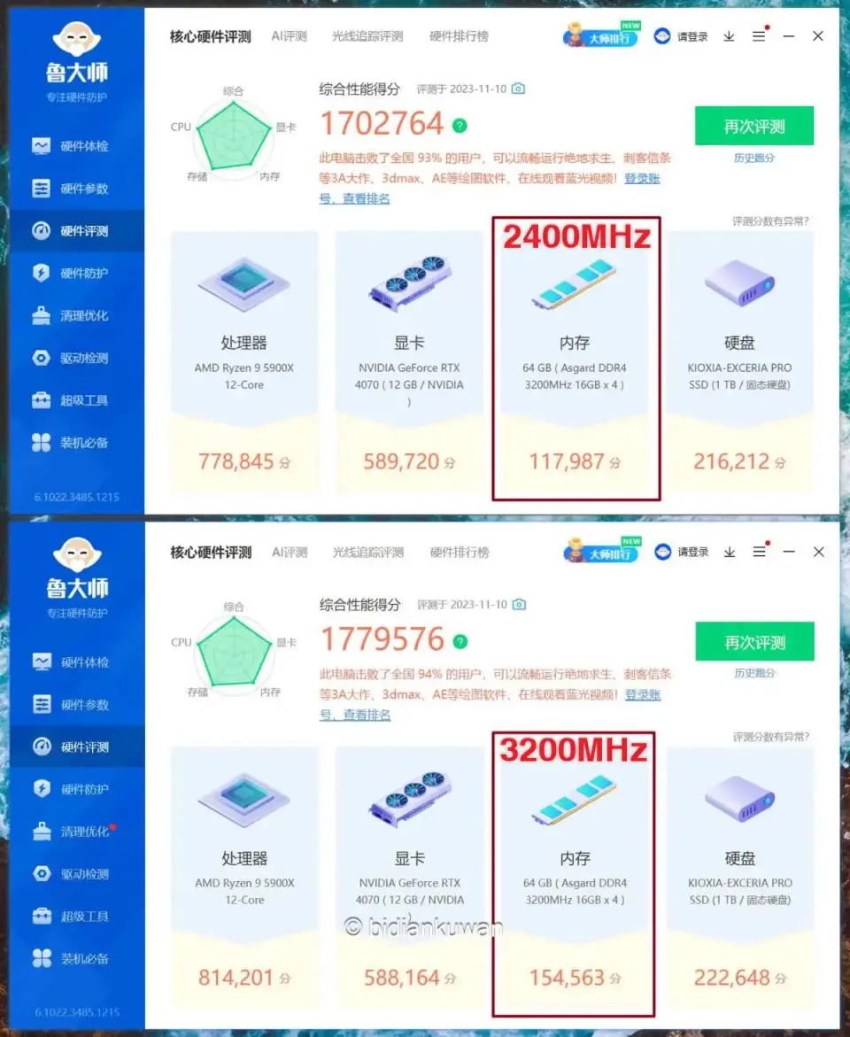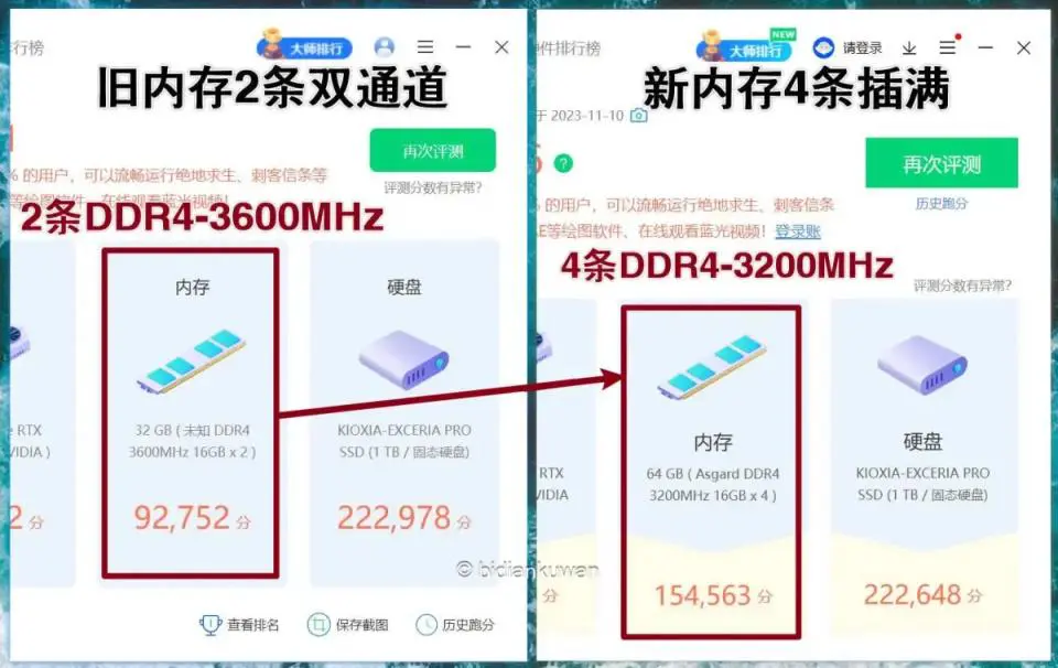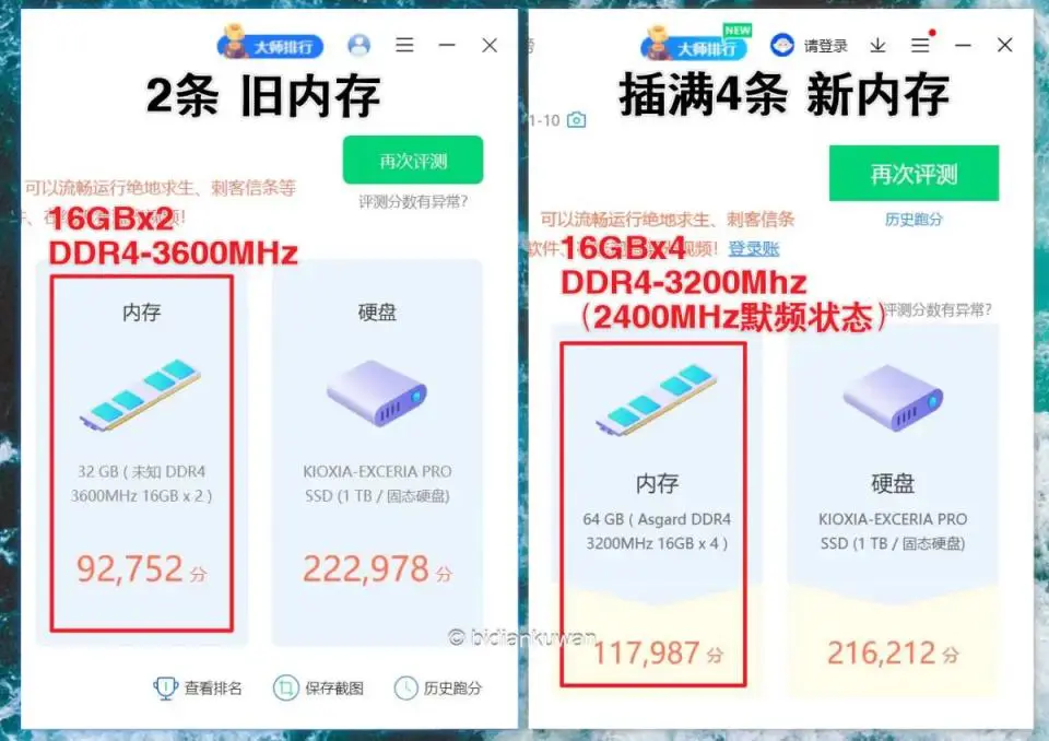 我可以明确地告诉大家,旧电脑加内存确实可以提高流畅度,但提升有限,且有条件制约。 同平台对比实测:将2条16GB的DDR4-3600MHz的内存条,换成4条16GB的DDR4-3200MHz,娱乐大师跑分从32GB的92.7万,来到了64GB内存条的15.5万。虽然因为新内存频率略低,纸面评分没有翻一倍,但也有了将近67%的提升。