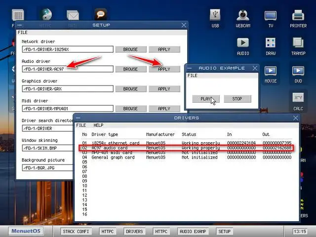 虽然你可能通过 ftp 成功连接到 MenuetOS 上,但我要告诉你的是,这玩意居然是只读的。 也就是说,它假装它能上传文件,其实并不保存任何文件,只能下载,原因等会儿会说。 音频 和前面网络设定类似,我们需要先应用驱动程序,待音频设备激活后才能正常使用声卡。 通过 MenuetOS 自带的音频示例,我们能听到它发出哆唻咪发的音乐声。