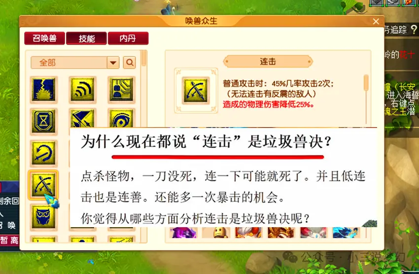 梦幻西游中有一些玩家是比较喜欢连善的,但是在现在的梦幻西游中,另外一部分玩家却认为连击是垃圾技能。连击之所以会是垃圾技能,是因为连击会降低召唤兽25%的攻击,虽然有45%的几率能够打两次,但是能够打两次是随机的,但是降低25%的伤害却是永久的,所以各位玩家如果想要自己的召唤兽的输出更高,但是不想投入抬高的成本,最好的选择其实是弄壁垒的召唤兽。弄出超级壁垒的赐福以后壁垒击破的伤害会特别高。 19轮抓鬼任务给的奖励,号主表示给的最值钱的是牡丹