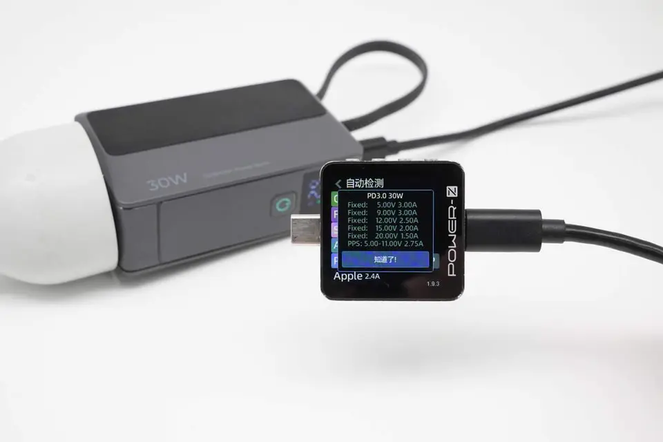 充电器模式下,使用ChargerLAB POWER-Z KT003C测得USB-C线支持QC3.0/4+、FCP、SCP、AFC、PD3.0、PPS、DCP、Apple 2.4A充电协议。
