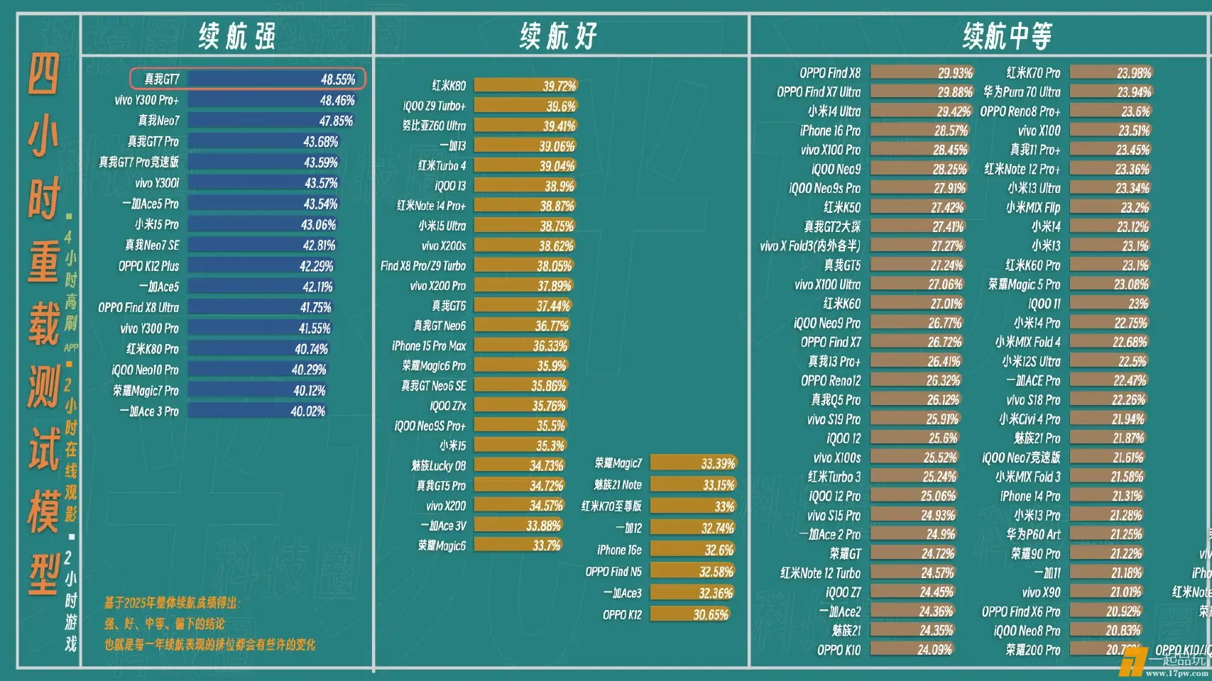 感觉真我现在很明确的路线就是性能强+续航强,实测真我GT7续航表现真的稳,游戏表现也很强,性能续航双冠王可真不是白叫的。续航到底有多稳呢?天玑9400+最新的3nm平台和7200mAh电池容量,在我这里三天三个场景充满电到关机的测试后,模拟四小时重载测试,#真我GT7#再次刷新榜单第一,剩余电量48.55%。再看看我说的真我的大电池路线,前五中有四个是真我,续航好,就是真我现在的标签。如果你对续航有要求,喜欢玩游戏的,那只要2599的真我GT7就是你当下绕不开的旗舰之选。