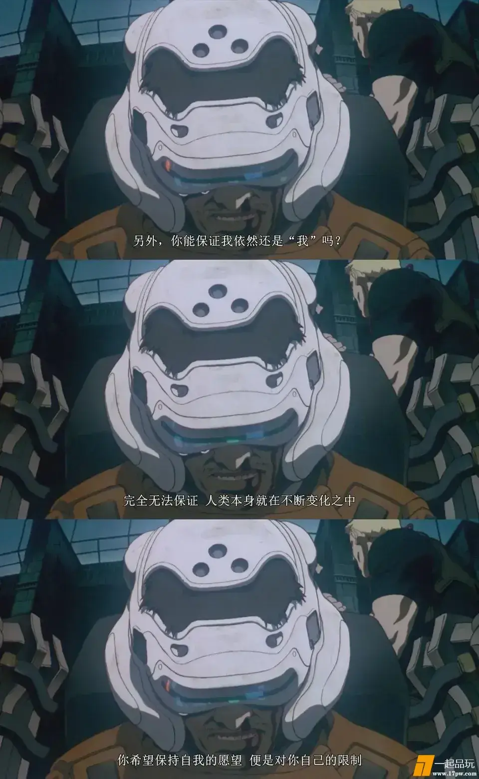 《攻壳机动队》(1995)截图 但《攻壳机动队》动画不能绕开,这是士郎正宗和押井守两个大师相遇的地方,它的深度精度迄今无人能够超越,能与之媲美的只有另一大师大友克洋的《阿基拉AKIRA》。《攻壳机动队》是赛博朋克动画精神之精华,可以说受其启迪的《黑客帝国Matrix》电影系列仅能拾其皮毛而已。它是一部未来的存在主义电影,问着那个永恒的问题:“我是谁?我为什么存在?我要往何处去?” 在阴雨绵绵的近未来、某类似香港的架空飞地(漫画版里明说是2029年的日本“New Port City”),攻壳机动队少佐草薙素子接触到在数字网络之海自我淤生的存在物“人偶师”,惊觉自己的存在正被异化为“非人”,最后两人融合一体,成为了网络海洋中自由的游击者/高级黑客。 “人类本身就处在不断变化之中,希望保持自我的‘我执’一直在限制你……我连接在一个庞大的网络上,我自身只是其中的一小部分。对尚未接触体验到的你而言,也许只能感知其为一道光芒。吾等均曾束于一隅,故需彼此比邻而连,我们是一切的集合体,虽只依附于些微的机能,但现在是时候冲破捆绑我们的藩篱枷锁,升入更高层的构造。”——傀儡师引诱素子与ta“融合”前说的这一番话,多少带着神秘主义而不是科学色彩,今天读让我想起了田坂广志《死亡并不存在》里“基于量子物理学的新假说”,但无论如何,它们为我们捉襟见肘的人生提供着不一样的出口——翻译成老话,也就是去蔽、无我、人是必须超越的。