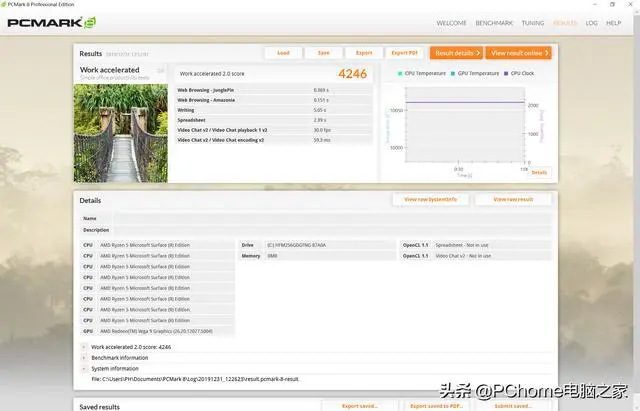 PCMark 8 Work accelerate性能测试 PCMark 8是新一代系统综合性能测试软件,可以衡量各种类型PC的综合性能。PCmark8中囊括了非常大的测试数据量,包含七个不同的测试环节,由总共25个独立工作负载组成,涵盖了存储、 计算、图像与视频处理、网络浏览、游戏等PC日常应用的方方面面来评测我们的硬件能力。在PCMARK 8 Work accelerate的测试中,微软Surface Laptop 3在Work accelerated一项中获4246分,整机性能值得肯定,日常用来处理办公软件、图片处理等工作完全可以胜任。