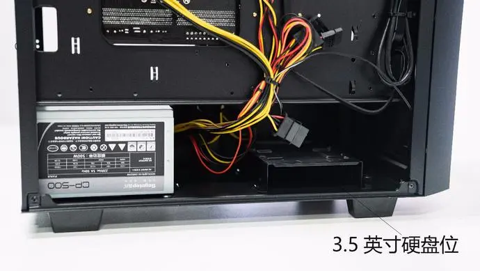 电源仓和主板仓进行了分置,让热量不会过多的在机箱内蓄积,在电源的旁边有一个3.5英寸的机械硬盘安装位。