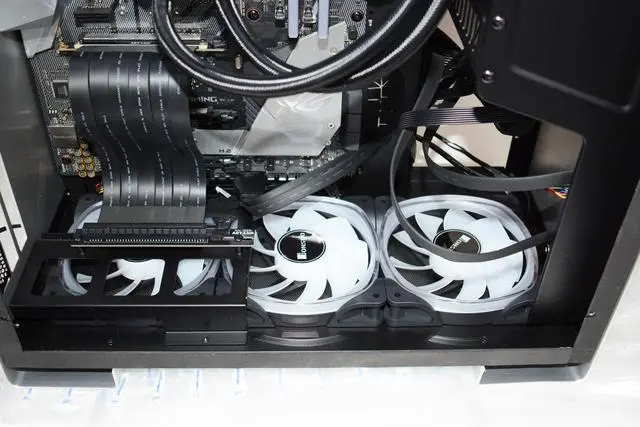 机箱底部设置了3个风扇位,对于垂直风道的机箱来说,有条件,底部风扇还是要安装一下的。显卡位置还有一个显卡底座,来辅助显卡完成竖装。