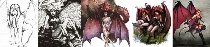 从左至右,分别为《龙与地下城》 1E 到 5E 中魅魔的造型