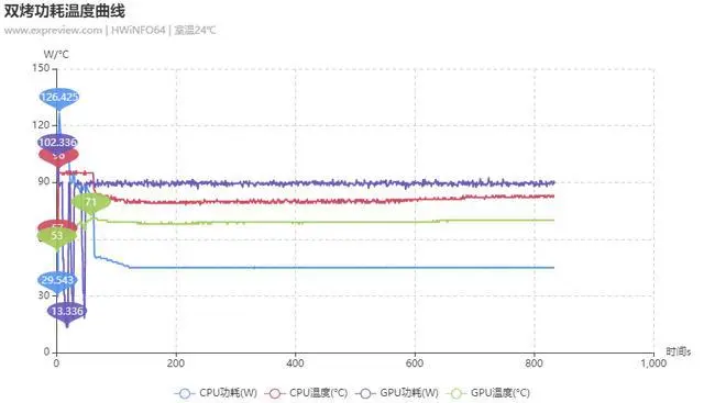 在风扇转速预先拉至100%的情况下,CPU的极限性能释放情况比增强模式下要稍好一些,另外,在CPU功率下降到45W之后,风扇转速仍然维持在100%,这也让CPU的温度相较要更低一些。