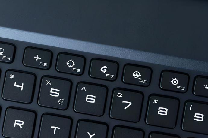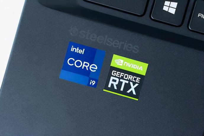 C面看着设计很规整,电源键被设计成与键盘区域融为一体(在键盘右上角),并且电源键上集成有GPU模式指示灯,在启用显卡直连的时候是橙色的灯,用核显输出的时候是白色的灯。此外,这个键盘是具有单键RGB背光的,键盘技术方面有与外设大厂赛睿合作,键盘的左下角可以看到赛睿的logo。而键盘右上角则可以看到丹拿的logo,说明扬声器的技术方面有与丹拿合作。