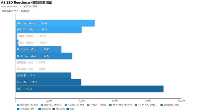 另外,用AS SSD测出来的结果则是4766MB/s的连续读取,3975MB/s的连续写入,55.23MB/s的随机读取,158.11MB/s的随机写入,延迟方面4K随机读取延迟为36μs,4K随机写入延迟为27μs。最终总得分为8923,是一款旗舰级的SSD表现。