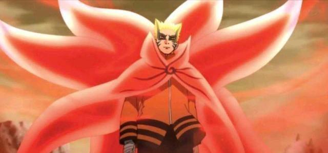 鸣人在慈弦的身边落下,卷起了大量的尘土,还伴随着红色的气流。博人的身体上出现了九尾的查克拉,然后鸣人的重粒子模式露出了真面目。这个形态下,鸣人的眼睛一圈都是黑色的,还有两根黑色的线条从头发的地方连接到眼睛,有点像九尾的耳朵。鸣人重粒子模式这个出场很帅气,而且背景音乐满分。